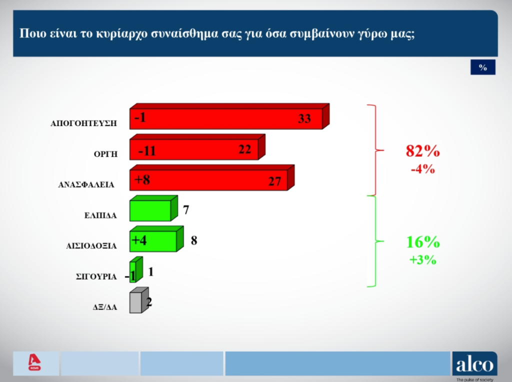 Το 82% δηλώνει πως το κυρίαρχο συναίσθημα για «όσα συμβαίνουν» είναι είτε απογοήτευση, είτε οργή, είτε ανασφάλεια, την ώρα που ελπίδα, αισιοδοξία ή σιγουριά δηλώνει πως αισθάνεται το 16% των συμμετεχόντων.