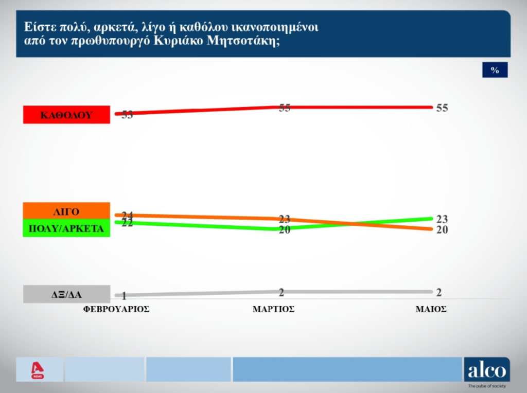 Καθόλου ικανοποιημένοι από την απόδοση της κυβέρνησης δηλώνουν πάνω από τους μισούς συμμετέχοντες στην έρευνα (53%). Πολύ ή αρκετά ικανοποιημένο είναι, κατά δήλωσή του, το 21%. Καθόλου ικανοποιημένο από τον πρωθυπουργό δηλώνει το 55%, πολύ ή αρκετά ικανοποιημένο είναι το 23%.