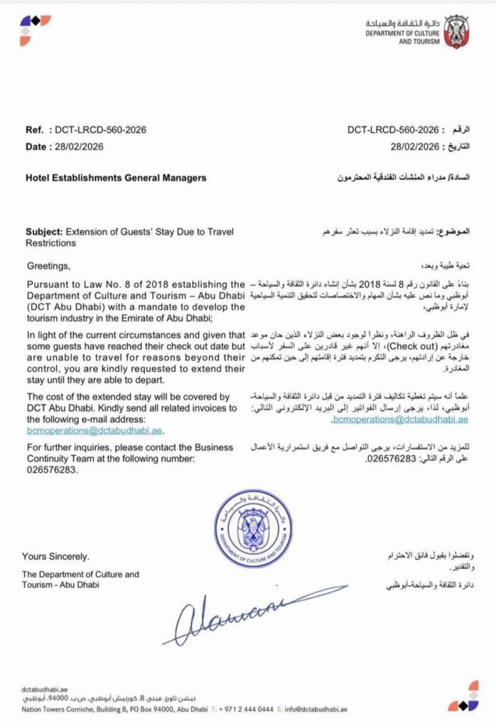 Η Διεύθυνση Πολιτισμού και Τουρισμού του Άμπου Ντάμπι καλεί τα ξενοδοχεία να επεκτείνουν τη διαμονή επισκεπτών που αδυνατούν να ταξιδέψουν, αναλαμβάνοντας την κάλυψη των σχετικών εξόδων μέχρι να καταστεί δυνατή η αναχώρησή τους.