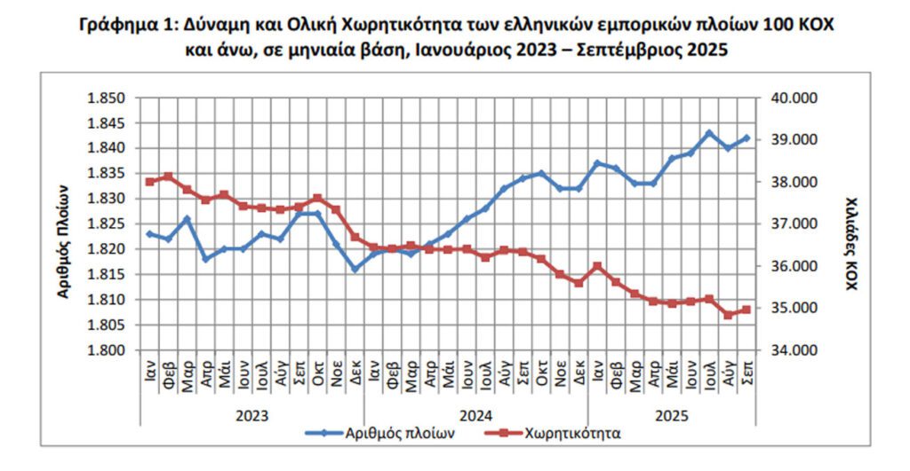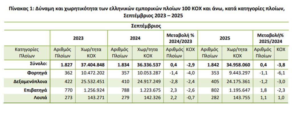 • Η Ολική Χωρητικότητα του Ελληνικού Εμπορικού Στόλου, από πλοία 100 ΚΟΧ και άνω, παρουσίασε μείωση κατά 3,8% τον μήνα Σεπτέμβριο 2025 σε σύγκριση με την αντίστοιχη χωρητικότητα του Σεπτεμβρίου 2024.