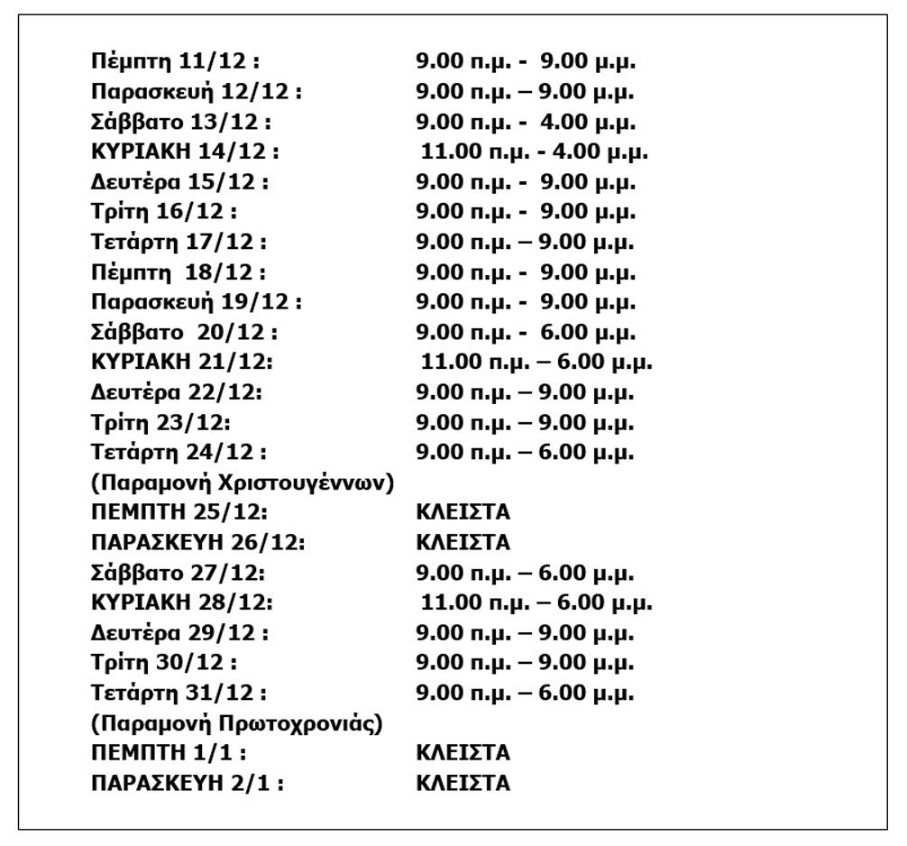 Το Σάββατο 3/1/2026, επανέρχεται το ωράριο που ακολουθείται από τα καταστήματα