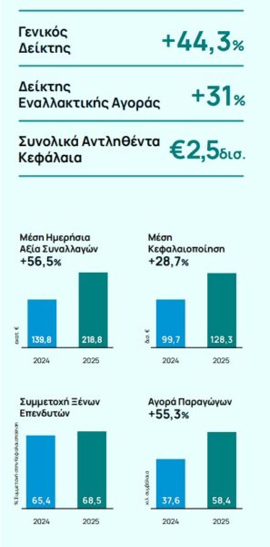 Η συνολική κεφαλαιοποίηση της αγοράς αυξήθηκε κατά €43,0 δισ. και διαμορφώθηκε σε €146,8 δισ., επίπεδα που αποτελούν την υψηλότερη αποτίμηση της αγοράς από τον Ιούνιο 2008. Το 2025, η μέση ημερήσια συναλλακτική δραστηριότητα ενισχύθηκε σημαντικά, για πέμπτο συνεχόμενο έτος, φθάνοντας τα €218,8 εκατ., το υψηλότερο επίπεδο από το 2008.
