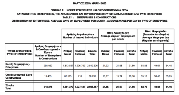 Από την επεξεργασία των «Αναλυτικών Περιοδικών Δηλώσεων Ασφαλισμένων Ιδιωτικού Δικαίου» που υποβλήθηκαν για τον Μάρτιο του 2025 και από τις εγγραφές, οι οποίες έχουν ελεγχθεί κατά το χρόνο επεξεργασίας, προέκυψαν τα ακόλουθα: