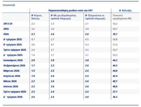 Το σύστημα παρακολούθησης μισθών της Ευρωπαϊκής Κεντρικής Τράπεζας (ΕΚΤ), το οποίο καλύπτει τις ενεργές συλλογικές συμβάσεις εργασίας, δείχνει αύξηση των διαπραγματευμένων μισθών με εξομαλυμένες εφάπαξ πληρωμές 3,2% το 2025 (βάσει κάλυψης 50,7% των εργαζομένων στις συμμετέχουσες χώρες) και 2,3% το 2026 (βάσει κάλυψης 39,7% ). Η κάλυψη μειώνεται σταδιακά στον μελλοντικό ορίζοντα, καθώς οι συμφωνίες εξακολουθούν να υπογράφονται το 2026.