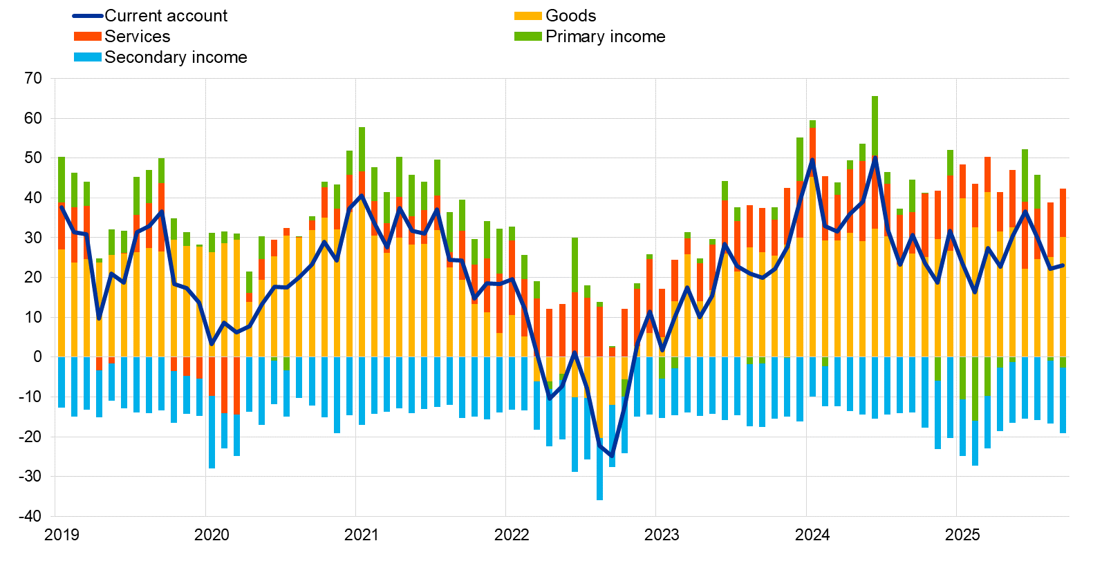 Το ισοζύγιο τρεχουσών συναλλαγών της ζώνης του ευρώ κατέγραψε πλεόνασμα 23 δισεκατομμυρίων ευρώ τον Σεπτέμβριο του 2025, αύξηση 1 δισεκατομμυρίου ευρώ σε σχέση με τον προηγούμενο μήνα (Διάγραμμα 1 και Πίνακας 1). Πλεονάσματα καταγράφηκαν σε αγαθά (30 δισεκατομμύρια ευρώ) και υπηρεσίες (12 δισεκατομμύρια ευρώ). Αυτά αντισταθμίστηκαν εν μέρει από ελλείμματα στο δευτερογενές εισόδημα (17 δισεκατομμύρια ευρώ) και στο πρωτογενές εισόδημα (3 δισεκατομμύρια ευρώ).