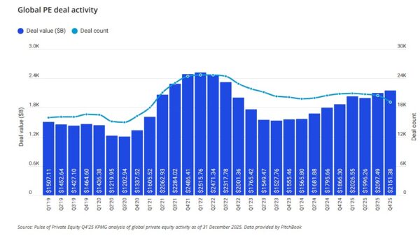 Οι παγκόσμιες επενδύσεις σε ιδιωτικά κεφάλαια αυξάνονται στα 2,1 τρισεκατομμύρια δολάρια το 2025, από 1,8 τρισεκατομμύρια δολάρια το 2024, σύμφωνα με την έκθεση Pulse of Private Equity Q4’25 της KPMG.