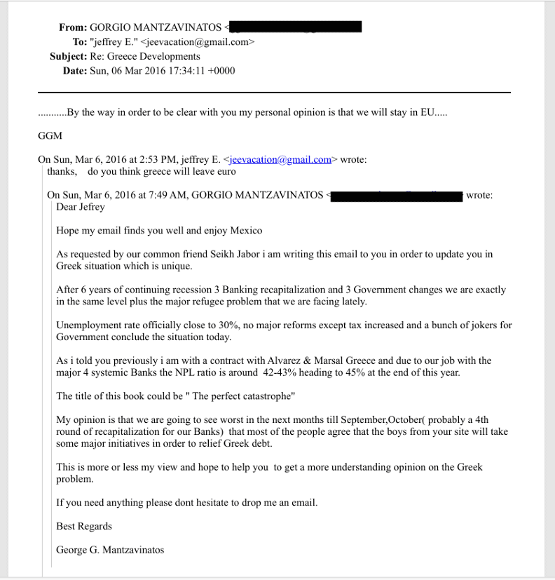 Αποστολέας είναι ο Γιώργος Μαντζαβινάτος, τραπεζικό στέλεχος και σύμβουλος αναδιαρθρώσεων, ο οποίος απευθύνεται στον Τζέφρι Επστάιν προκειμένου να εξηγήσει την ελληνική κατάσταση.
