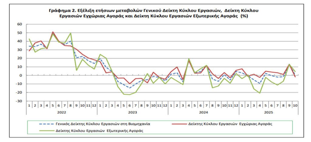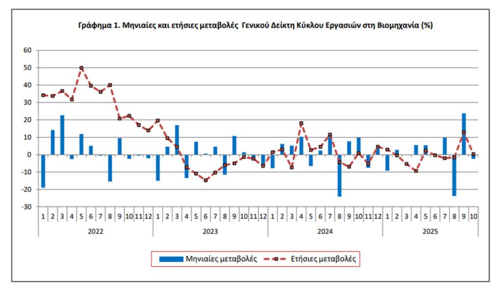 Η Ελληνική Στατιστική Αρχή ανακοίνωσε τον Δείκτη Κύκλου Εργασιών στη Βιομηχανία, με μήνα αναφοράς τον Οκτώβριο 2025, η εξέλιξη του οποίου σύμφωνα με προσωρινά στοιχεία, έχει ως εξής: