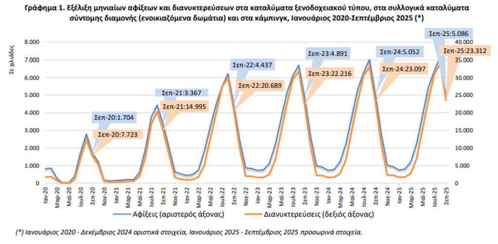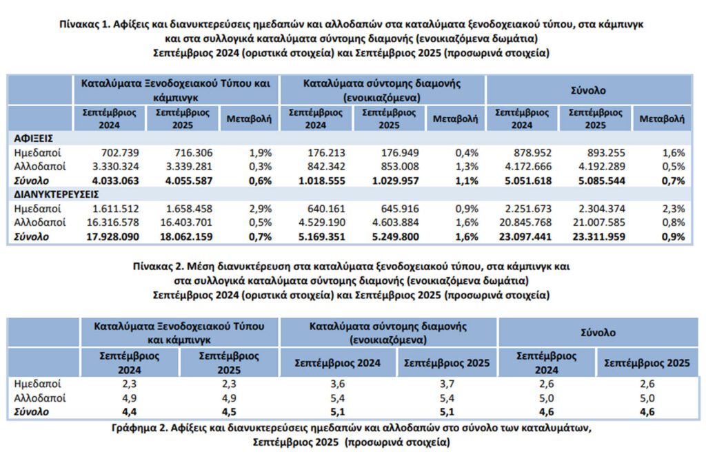 Η Ελληνική Στατιστική Αρχή (ΕΛΣΤΑΤ) ανακοίνωσε τα προσωρινά μηνιαία στοιχεία κίνησης καταλυμάτων ξενοδοχειακού τύπου, κάμπινγκ και συλλογικών καταλυμάτων σύντομης διαμονής (ενοικιαζόμενα δωμάτια), για τον μήνα αναφοράς Σεπτέμβριο 2025.