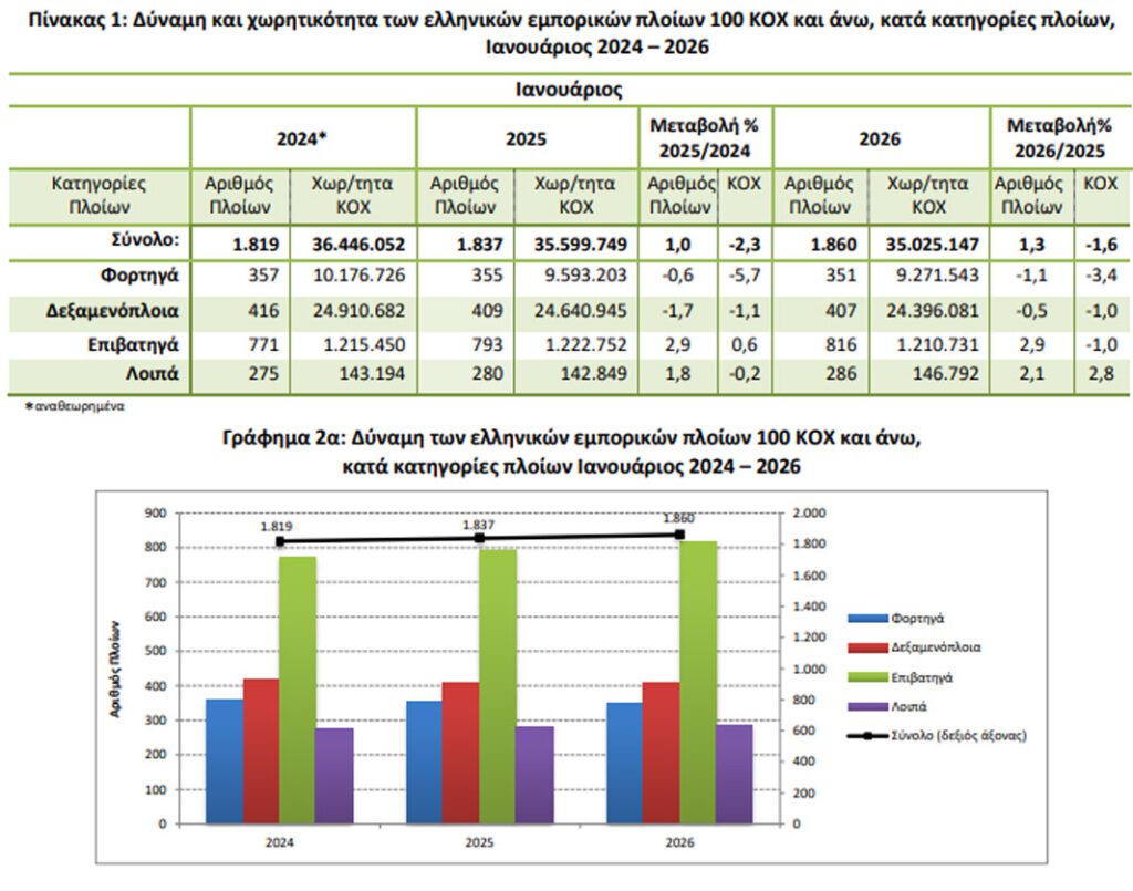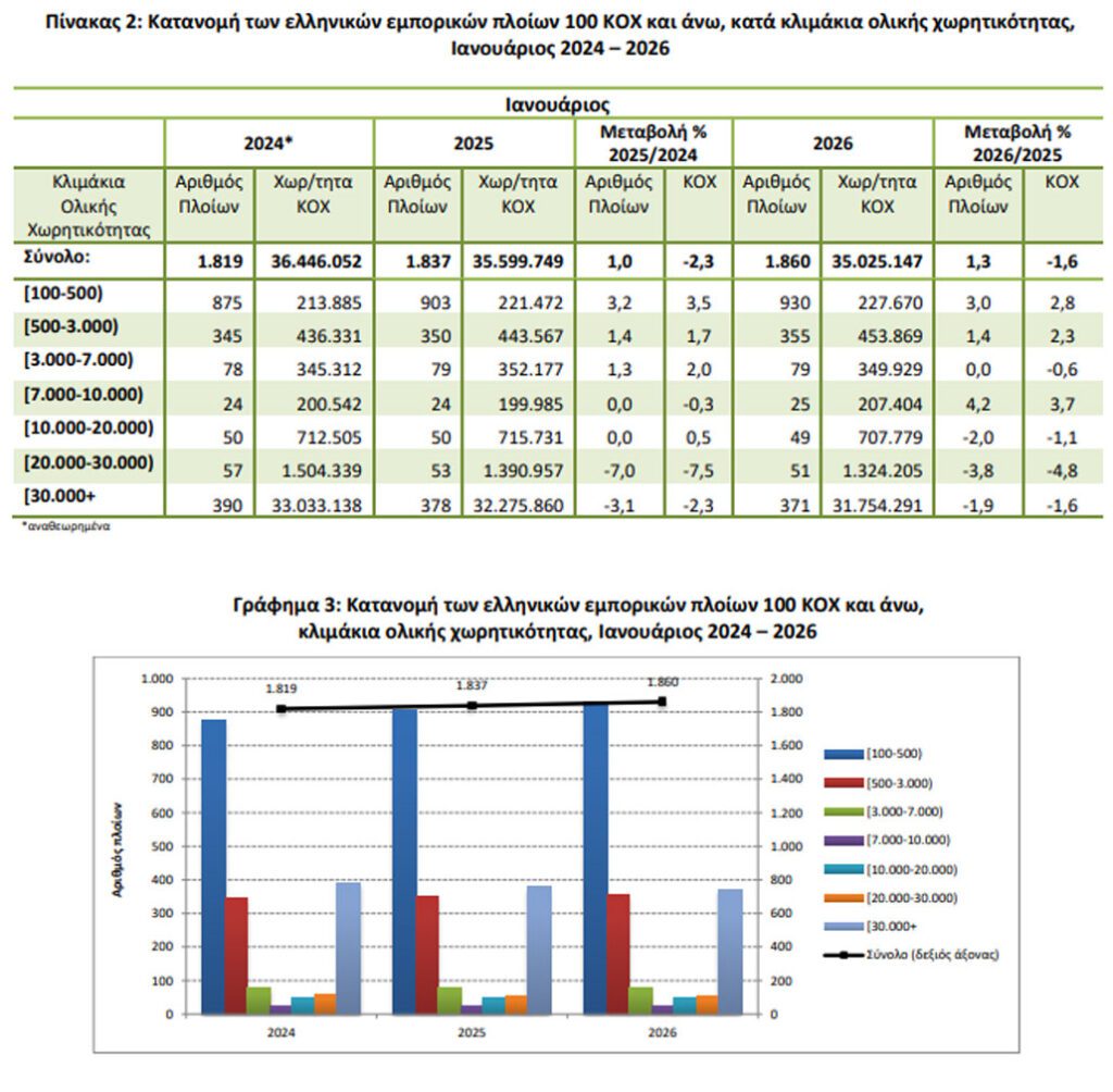 • Η Ολική Χωρητικότητα του Ελληνικού Εμπορικού Στόλου, από πλοία 100 ΚΟΧ και άνω, παρουσίασε μείωση κατά 1,6% τον μήνα Ιανουάριο 2026 σε σύγκριση με την αντίστοιχη χωρητικότητα του Ιανουαρίου 2025.