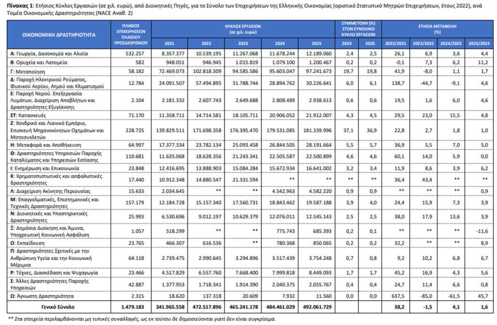 Για το σύνολο των επιχειρήσεων και των δραστηριοτήτων της οικονομίας, ο κύκλος εργασιών το έτος 2025 ανήλθε σε 492.061.729 χιλ. ευρώ σημειώνοντας αύξηση 1,6% σε σχέση με το έτος 2024, που είχε ανέλθει σε 484.461.029 χιλ. ευρώ.