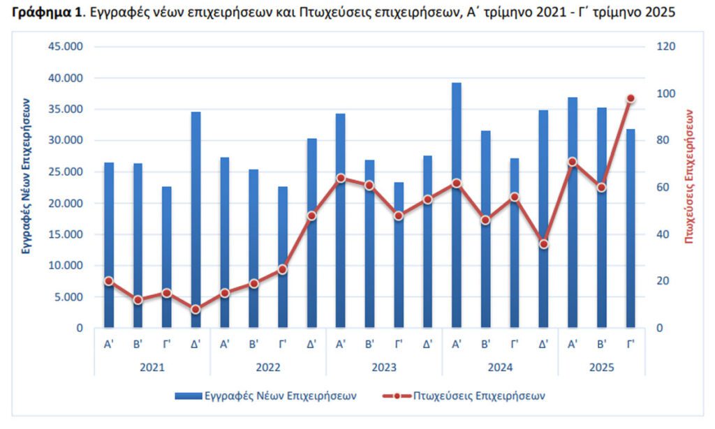 Η Ελληνική Στατιστική Αρχή (ΕΛΣΤΑΤ) ανακοίνωσε τα στοιχεία για τη δημογραφία των επιχειρήσεων στην Ελλάδα και ειδικότερα για τις Εγγραφές Νέων Επιχειρήσεων (ενάρξεις λειτουργίας επιχειρήσεων) και τις Πτωχεύσεις Επιχειρήσεων, για το Γ΄ τρίμηνο 2025.