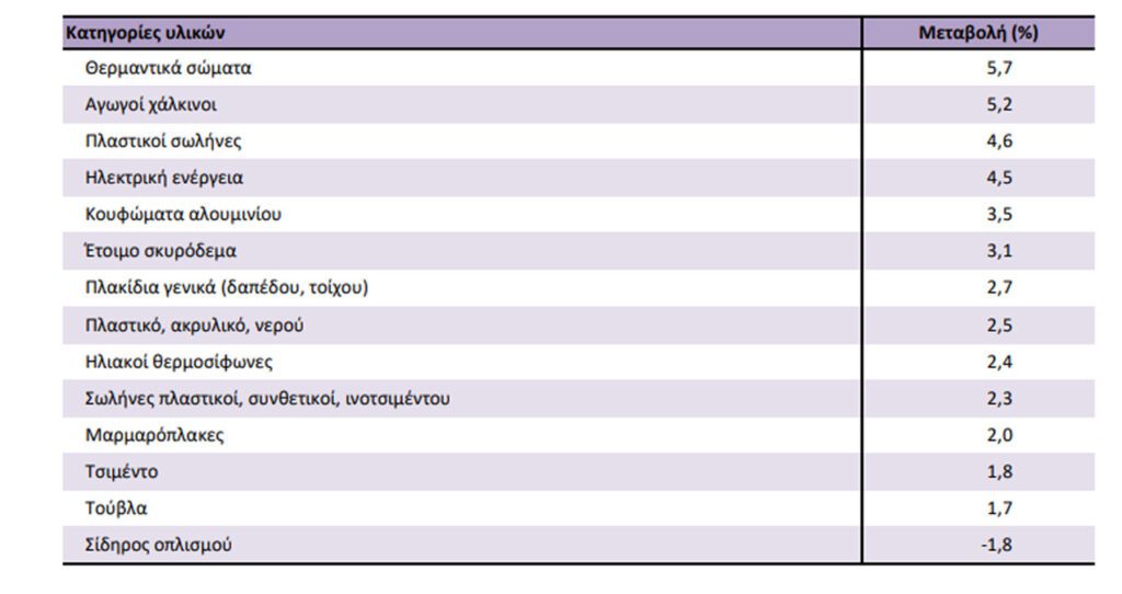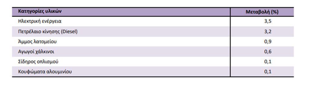 Οι κυριότερες μεταβολές των επιμέρους δεικτών τιμών κατηγοριών υλικών ήταν οι ακόλουθες: