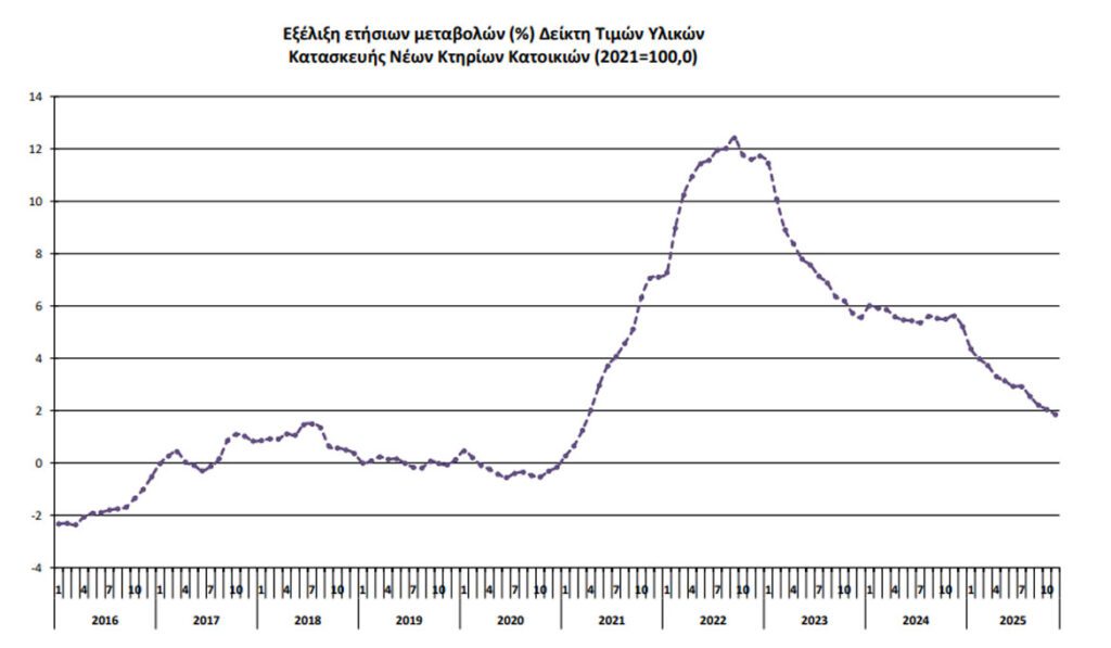 Ο Γενικός Δείκτης Τιμών Υλικών Κατασκευής Νέων Κτηρίων Κατοικιών, με μήνα αναφοράς τον Νοέμβριο 2025, σε σύγκριση με τον αντίστοιχο δείκτη του Νοεμβρίου 2024 παρουσίασε αύξηση 1,9%, έναντι αύξησης 5,6% που σημειώθηκε κατά τη σύγκριση των αντίστοιχων δεικτών του έτους 2024 με το 2023.