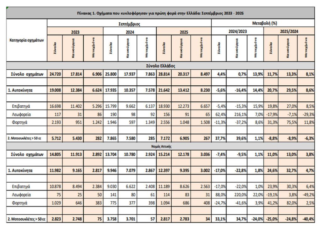 Η Ελληνική Στατιστική Αρχή ανακοίνωσε ότι κατά το μήνα Σεπτέμβριο του 2025 κυκλοφόρησαν για πρώτη φορά 21.642 αυτοκίνητα (καινούργια ή μεταχειρισμένα εξωτερικού) έναντι 17.935 που κυκλοφόρησαν τον αντίστοιχο μήνα του έτους 2024, παρουσιάζοντας αύξηση 20,7%.