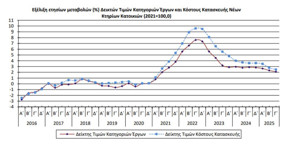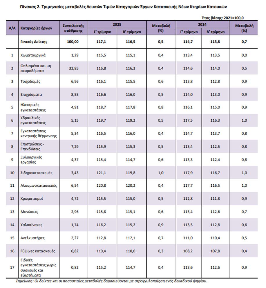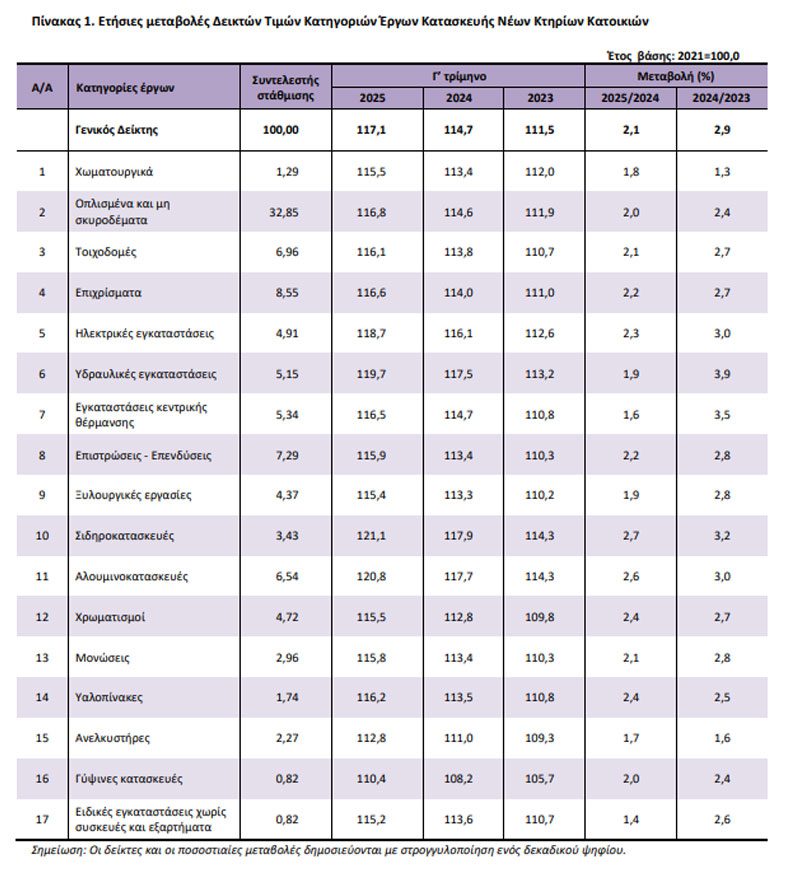 Ο Γενικός Δείκτης Τιμών Κατηγοριών Έργων Κατασκευής Νέων Κτηρίων Κατοικιών του Γ΄ τριμήνου 2025, σε σύγκριση με τον αντίστοιχο δείκτη του Γ΄τριμήνου 2024, παρουσίασε αύξηση 2,1%, έναντι αύξησης 2,9% που σημειώθηκε κατά την σύγκριση των αντίστοιχων δεικτών του έτους 2024 με το 2023, σύμφωνα με τα στοιχεία της ΕΛΣΤΑΤ.