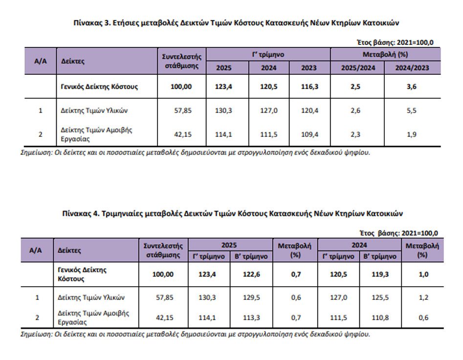 Ο Γενικός Δείκτης Τιμών Κόστους Κατασκευής Νέων Κτηρίων Κατοικιών του Γ΄ τριμήνου 2025, σε σύγκριση με τον αντίστοιχο δείκτη του Γ΄τριμήνου 2024, παρουσίασε αύξηση 2,5%, έναντι αύξησης 3,6% που σημειώθηκε κατά την αντίστοιχη σύγκριση των δεικτών του έτους 2024 με το 2023. Ειδικότερα, η ετήσια αύξηση κατά 2,5%, οφείλεται στην αύξηση του Δείκτη Τιμών Υλικών κατά 2,6% και στην αύξηση του Δείκτη Τιμών Αμοιβής Εργασίας κατά 2,3%.