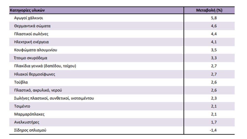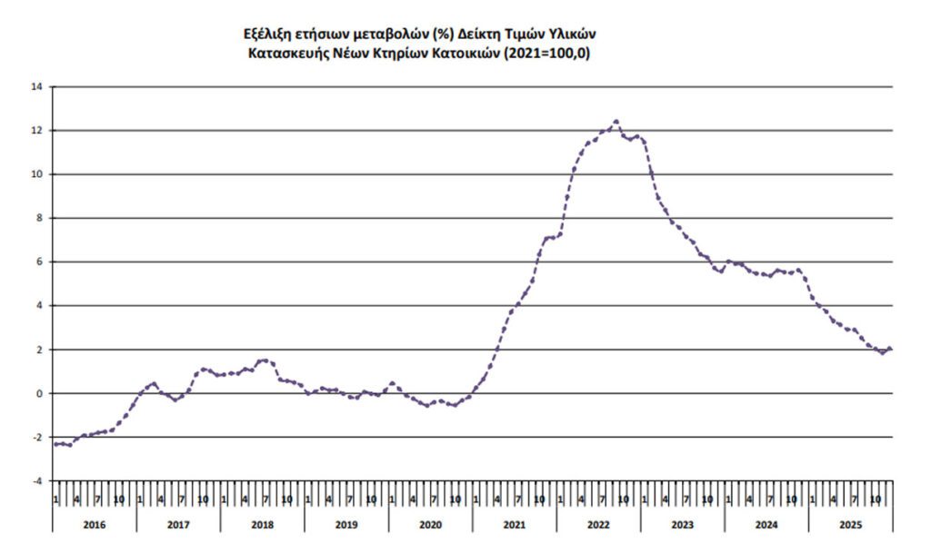 Ο Γενικός Δείκτης Τιμών Υλικών Κατασκευής Νέων Κτηρίων Κατοικιών, με μήνα αναφοράς τον Δεκέμβριο 2025, σε σύγκριση με τον αντίστοιχο δείκτη του Δεκεμβρίου 2024 παρουσίασε αύξηση 2,1%, έναντι αύξησης 5,2% που σημειώθηκε κατά τη σύγκριση των αντίστοιχων δεικτών του έτους 2024 με το 2023.