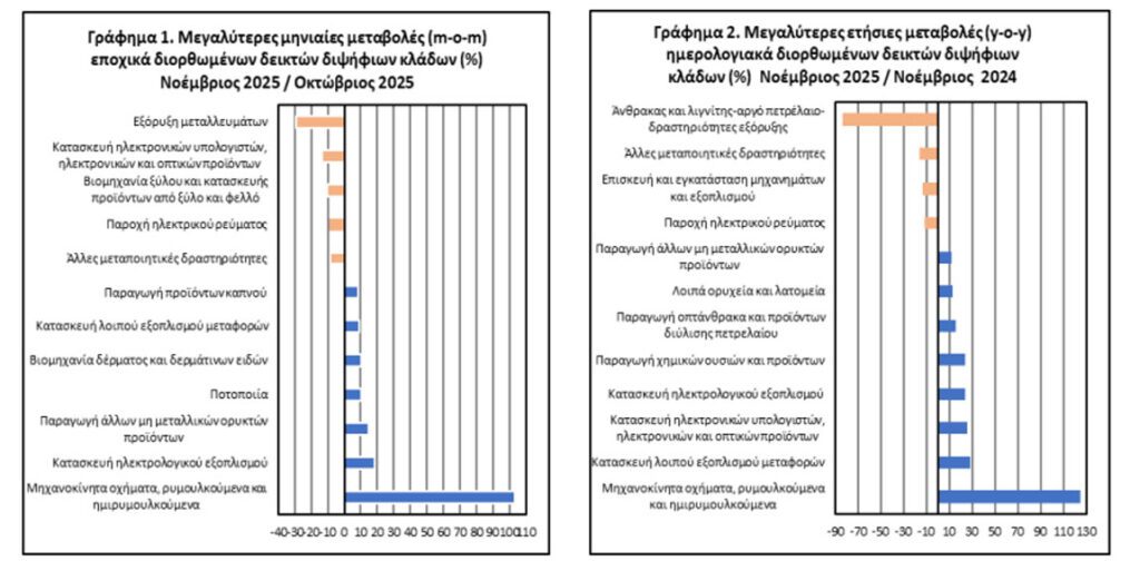 Κατά τη σύγκριση των δεικτών του Νοεμβρίου 2025 με τους αντίστοιχους δείκτες του Νοεμβρίου 2024, η μεγαλύτερη ποσοστιαία αύξηση καταγράφηκε στον κλάδο κατασκευής μηχανοκίνητων οχημάτων, ρυμουλκούμενων και ημιρυμουλκούμενων οχημάτων, ενώ η μεγαλύτερη ποσοστιαία μείωση καταγράφηκε στους κλάδους εξόρυξης άνθρακα και λιγνίτη – άντλησης αργού πετρελαίου και φυσικού αερίου – υποστηρικτικών δραστηριοτήτων εξόρυξης.