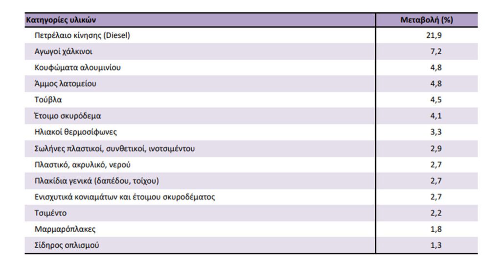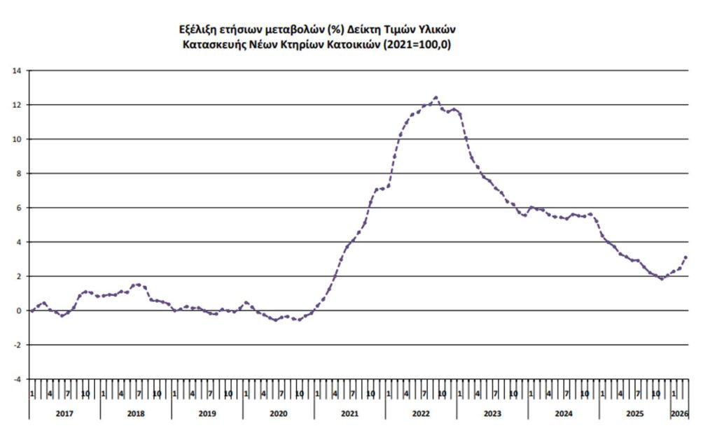 Ο Γενικός Δείκτης Τιμών Υλικών Κατασκευής Νέων Κτηρίων Κατοικιών, με μήνα αναφοράς τον Μάρτιο 2026, σε σύγκριση με τον αντίστοιχο δείκτη του Μαρτίου 2025 παρουσίασε αύξηση 3,1%, έναντι αύξησης 3,7% που σημειώθηκε κατά τη σύγκριση των αντίστοιχων δεικτών του έτους 2025 με το 2024.