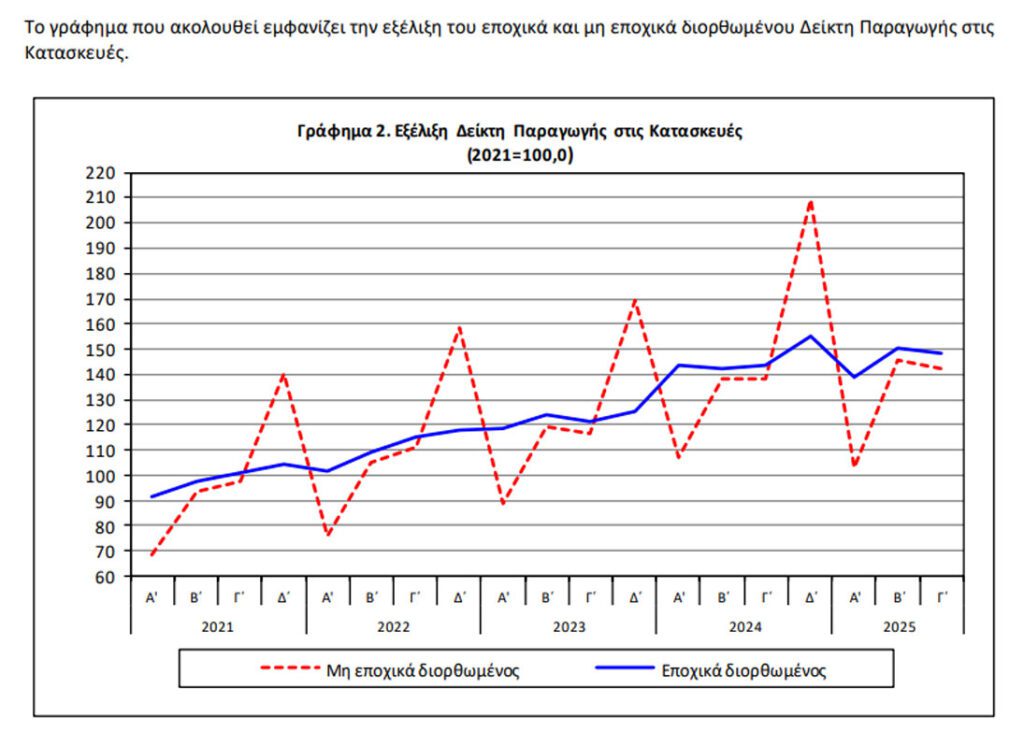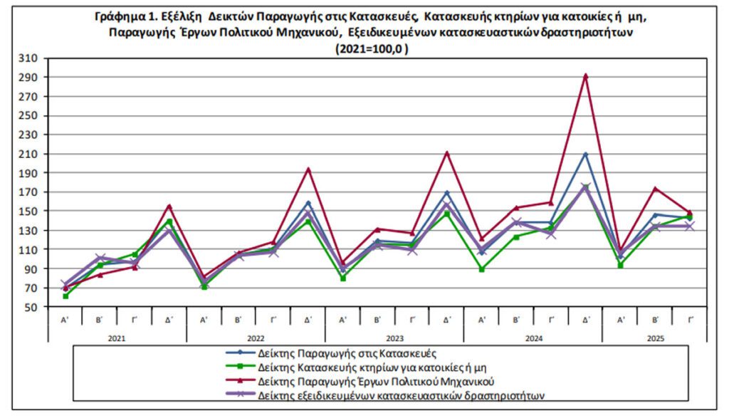 Η εξέλιξη του Δείκτη Παραγωγής στις Κατασκευές, με βάση τα στοιχεία της ΕΛΣΤΑΤ, με περίοδο αναφοράς το γ’ τρίμηνο 2025, σύμφωνα με προσωρινά και διορθωμένα ως προς το πλήθος των εργάσιμων ημερών στοιχεία, έχει ως εξής: