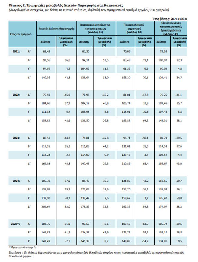 Ο Δείκτης Παραγωγής στις Κατασκευές του Γ΄ τριμήνου 2025, σε σύγκριση με τον αντίστοιχο δείκτη του β' τριμήνου 2025, παρουσίασε μείωση 2,3%