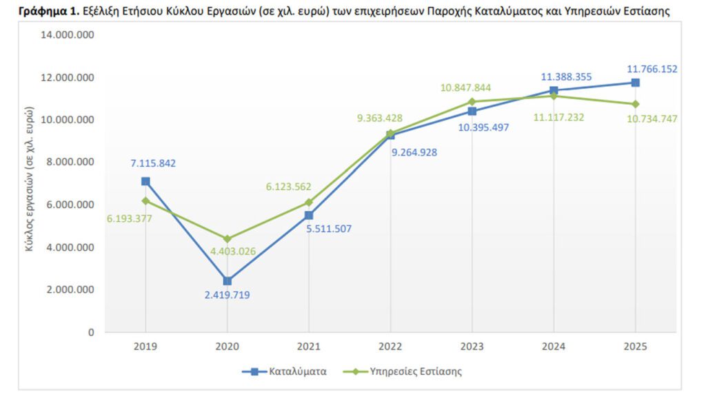 Αντίστοιχα, ο κύκλος εργασιών των επιχειρήσεων του κλάδου των Υπηρεσιών Εστίασης (κλάδος 56 της ταξινόμησης NACE Αναθ.2), το έτος 2025 ανήλθε σε 10.734.747 χιλ. ευρώ, σημειώνοντας μείωση 3,4% σε σχέση με το έτος 2024, όπου είχε ανέλθει σε 11.117.232 χιλ. ευρώ.