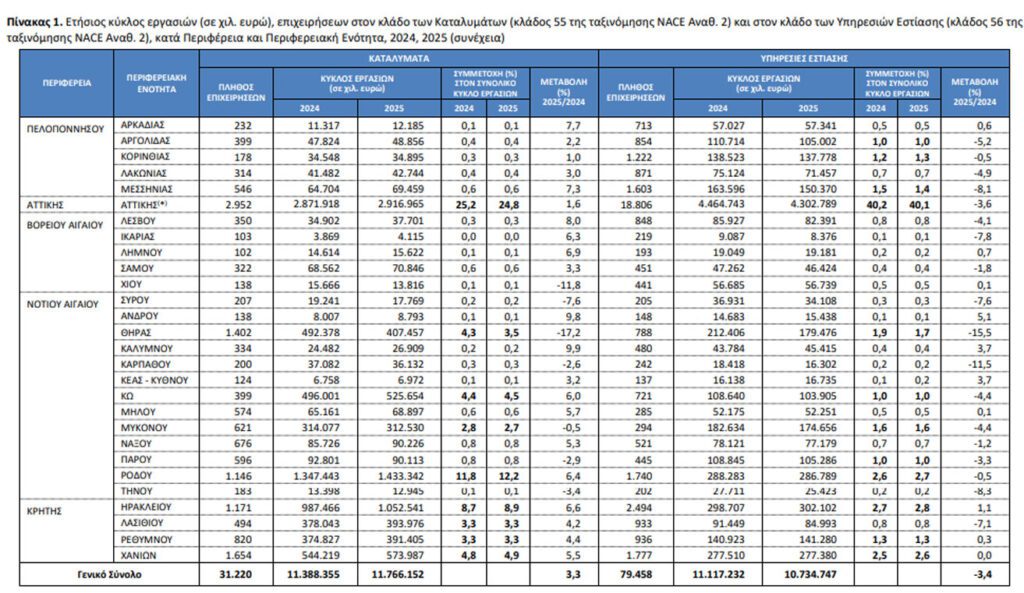 Η Ελληνική Στατιστική Αρχή (ΕΛΣΤΑΤ) ανακοίνωσε στοιχεία που αφορούν στην εξέλιξη του κύκλου εργασιών των επιχειρήσεων που δραστηριοποιούνται στους κλάδους των Καταλυμάτων και των Υπηρεσιών Εστίασης, κατά Περιφερειακή Ενότητα της Ελλάδας, με ενσωμάτωση των πιο πρόσφατων στοιχείων για τον κύκλο εργασιών από Διοικητικές Πηγές, Δ΄ τριμήνου 2025.