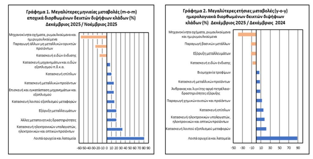 Ο δείκτης του κλάδου λοιπών ορυχείων και λατομείων, σημείωσε τη μεγαλύτερη ποσοστιαία αύξηση ενώ ο δείκτης του κλάδου κατασκευής μηχανοκίνητων οχημάτων, ρυμουλκούμενων και ημιρυμουλκούμενων οχημάτων, σημείωσε τη μεγαλύτερη ποσοστιαία μείωση, κατά τον Δεκέμβριο 2025 σε σχέση με τον Νοέμβριο 2025.