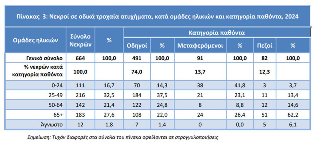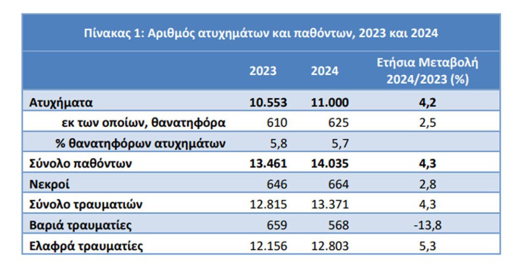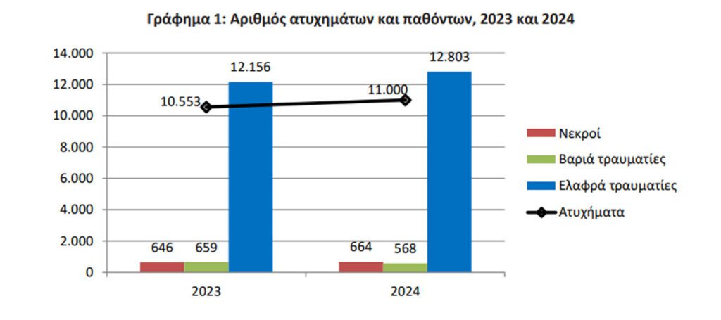 Αναλυτικότερα, από τα παθόντα πρόσωπα των οδικών τροχαίων ατυχημάτων το 2024, καταγράφηκαν 664 νεκροί, 568 βαριά τραυματίες και 12.803 ελαφρά τραυματίες, έναντι 646 νεκρών, 659 βαριά τραυματιών και 12.156 ελαφρά τραυματιών το 2023, παρουσιάζοντας αύξηση κατά 2,8% σε νεκρούς, μείωση 13,8% σε βαριά τραυματίες και αύξηση 5,3% σε ελαφρά τραυματίες.
