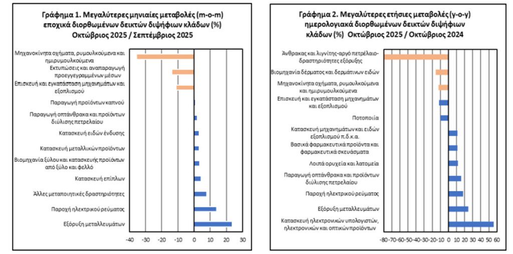 Κατά τη σύγκριση των δεικτών του Οκτωβρίου 2025 με τους αντίστοιχους δείκτες του Οκτωβρίου 2024, η μεγαλύτερη ποσοστιαία αύξηση καταγράφηκε στον κλάδο κατασκευής ηλεκτρονικών υπολογιστών, ηλεκτρονικών και οπτικών προϊόντων, ενώ η μεγαλύτερη ποσοστιαία μείωση καταγράφηκε στους κλάδους εξόρυξης άνθρακα και λιγνίτη – άντλησης αργού πετρελαίου και φυσικού αερίου – υποστηρικτικών δραστηριοτήτων εξόρυξης.