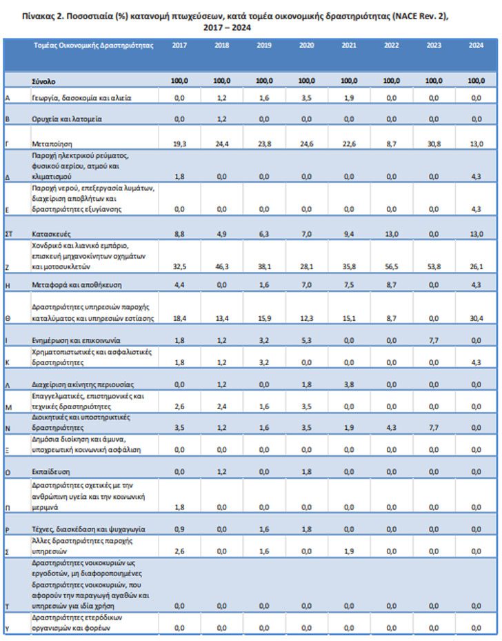 Από την ανάλυση των πτωχεύσεων που κηρύχθηκαν το έτος 2024, κατά τομέα οικονομικής δραστηριότητας (Nace Rev. 2), παρατηρείται ότι οι περισσότερες πτωχεύσεις πραγματοποιήθηκαν στον τομέα των δραστηριοτήτων υπηρεσιών παροχής καταλύματος και υπηρεσιών εστίασης με ποσοστό 30,4%, ακολουθεί ο τομέας του χονδρικού και λιανικού εμπορίου – επισκευής μηχανοκίνητων οχημάτων και μοτοσυκλετών με 26,1%, έπονται οι τομείς της μεταποίησης και κατασκευών με 13,0%, ακολουθούν οι τομείς της παροχής ηλεκτρικού ρεύματος, φυσικού αερίου, ατμού και κλιματισμού, παροχής νερού, επεξεργασίας λυμάτων, διαχείρισης αποβλήτων και δραστηριοτήτων εξυγίανσης, μεταφοράς και αποθήκευσης και χρηματοπιστωτικών και ασφαλιστικών δραστηριοτήτων με 4,3%.