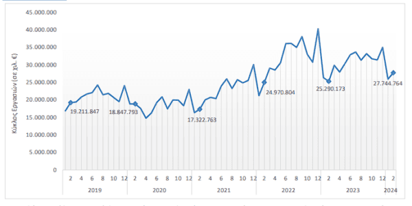 Συγκεκριμένα, η Ελληνική Στατιστική Αρχή (ΕΛΣΤΑΤ) ανακοίνωσε στοιχεία που αφορούν στην εξέλιξη του κύκλου εργασιών των επιχειρήσεων όλων των κλάδων δραστηριότητας της οικονομίας, με ενσωμάτωση των πιο πρόσφατων στοιχείων για τον κύκλο εργασιών από Διοικητικές Πηγές, Φεβρουαρίου 2024.
