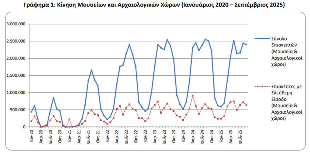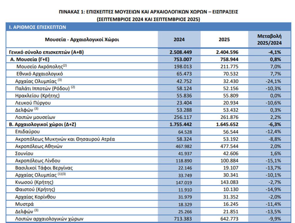 • Στους αρχαιολογικούς χώρους, κατά το εννεάμηνο Ιανουαρίου – Σεπτεμβρίου 2025 σε σχέση με την αντίστοιχη περίοδο του έτους 2024, παρατηρείται μείωση κατά 4,8% στον αριθμό επισκεπτών, αύξηση κατά 5,9% στους επισκέπτες ελεύθερης εισόδου και κατά 40,8% στις αντίστοιχες εισπράξεις.