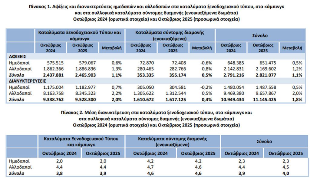 αντίστοιχα. Η μέση συνολική διανυκτέρευση για το μήνα Οκτώβριο 2025, ανήλθε σε 4,0 ημέρες.