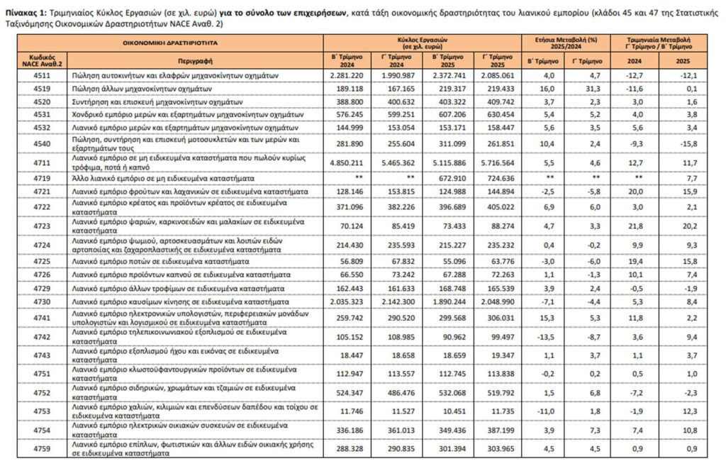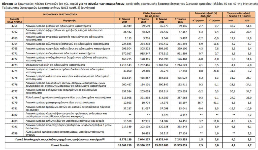Για τις επιχειρήσεις του τομέα λιανικού εμπορίου, χωρίς τους κλάδους οχημάτων, τροφίμων και καυσίμων, ο κύκλος εργασιών το τρίτο τρίμηνο 2025 ανήλθε σε 7.243.535 χιλ. ευρώ, σημειώνοντας αύξηση 2,8% σε σχέση με το τρίτο τρίμηνο 2024, όπου είχε διαμορφωθεί σε 7.044.227 χιλ. ευρώ και αύξηση 5,3% σε σχέση με το δεύτερο τρίμηνο του 2025 που είχε διαμορφωθεί σε 6.876.444 χιλ. ευρώ.