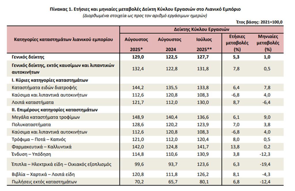 Η Ελληνική Στατιστική Αρχή ανακοίνωσε τους Δείκτες Κύκλου Εργασιών και Όγκου στο Λιανικό Εμπόριο, τον Αύγουστο 2025, η εξέλιξη των οποίων, σύμφωνα με στοιχεία προσωρινά και διορθωμένα ως προς τον αριθμό εργάσιμων ημερών τυπικού μήνα ίσης χρονικής διάρκειας, έχει ως εξής: