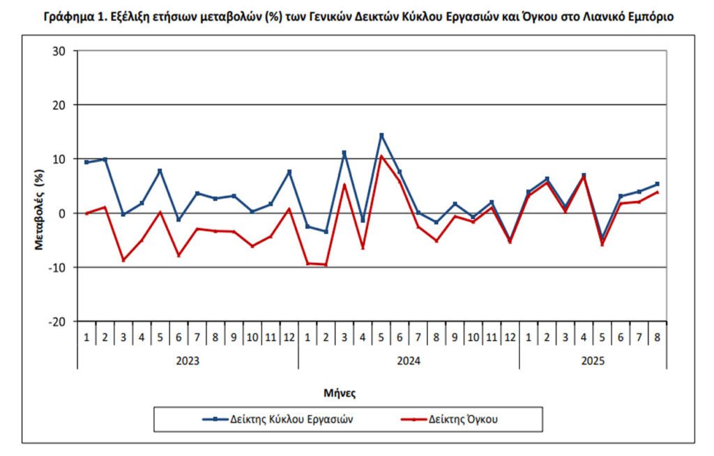 • Ο Γενικός Δείκτης Όγκου (κύκλος εργασιών σε σταθερές τιμές), κατά τον μήνα Αύγουστο 2025, σε σύγκριση με τον αντίστοιχο δείκτη του Αυγούστου 2024, παρουσίασε αύξηση 3,9% και σε σύγκριση με τον αντίστοιχο δείκτη του Ιουλίου 2025 αύξηση 1,7%.
