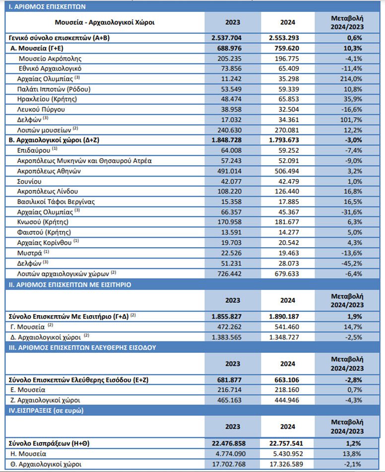 • Στους αρχαιολογικούς χώρους, κατά το οκτάμηνο Ιανουαρίου – Αυγούστου 2024, παρατηρείται αύξηση σε σχέση με την αντίστοιχη περίοδο του έτους 2023 κατά 6,7% στους επισκέπτες, κατά 8,2% στους επισκέπτες ελεύθερης εισόδου και κατά 6,6% στις αντίστοιχες εισπράξεις.