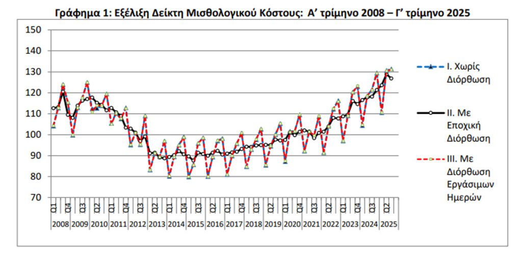 Η Ελληνική Στατιστική Αρχή (ΕΛΣΤΑΤ) ανακοίνωσε τον τριμηνιαίο Δείκτη Μισθολογικού Κόστους, στο σύνολο της οικονομίας, εξαιρουμένου του Πρωτογενή Τομέα και των Δραστηριοτήτων των Νοικοκυριών, για το γ’ τρίμηνο του έτους 2025.