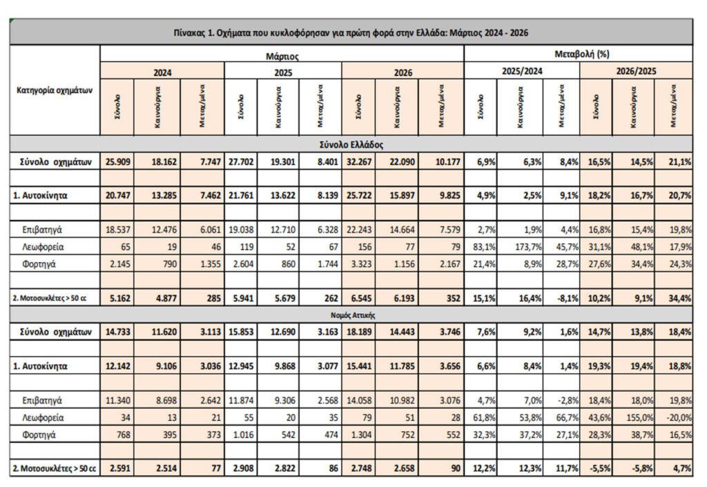 Η Ελληνική Στατιστική Αρχή ανακοίνωσε ότι κατά το μήνα Μάρτιο του 2026 κυκλοφόρησαν για πρώτη φορά 25.722 αυτοκίνητα (καινούργια ή μεταχειρισμένα εξωτερικού) έναντι 21.761 που κυκλοφόρησαν τον αντίστοιχο μήνα του έτους 2025, παρουσιάζοντας αύξηση 18,2%.