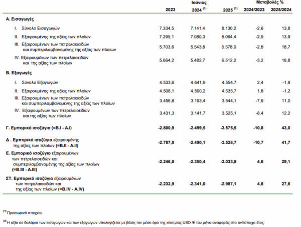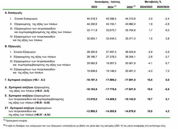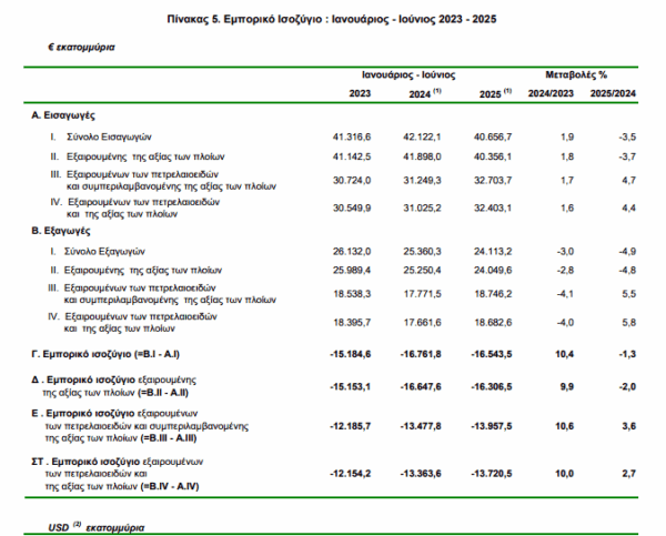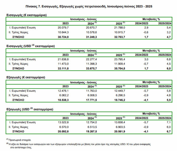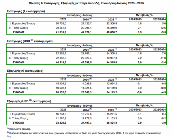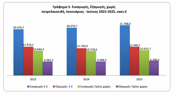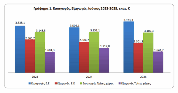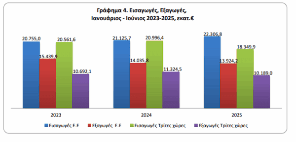 Στο εξάμηνο Ιανουαρίου-Ιουνίου 2025 το εμπορικό έλλειμμα κατέγραψε μείωση 1,3%, ενώ οι εξαγωγές κατέγραψαν πτώση κατά 4,9% .