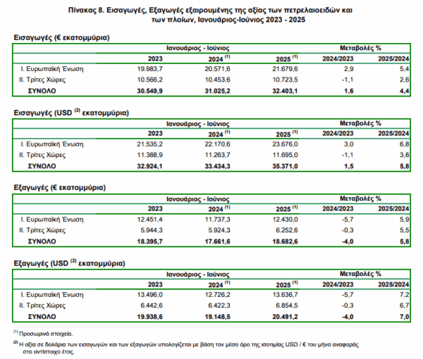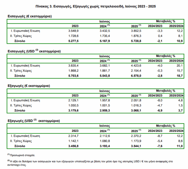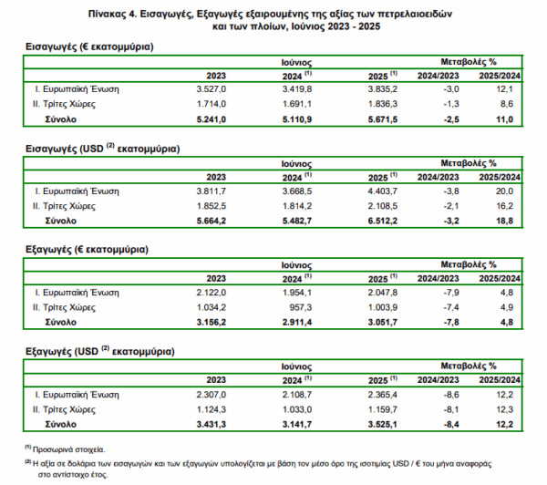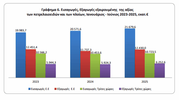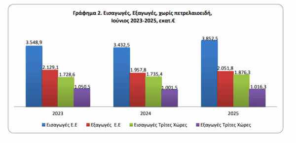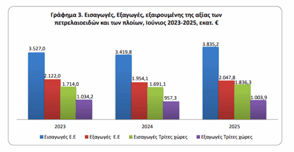 δηλαδή 20,5%, ενώ η αντίστοιχη αξία χωρίς τα πετρελαιοειδή και τα πλοία κατά τον μήνα Ιούνιο 2025 παρουσίασε αύξηση κατά 420,3 εκατ. ευρώ, δηλαδή 19,1% σε σχέση με τον μήνα Ιούνιο 2024.