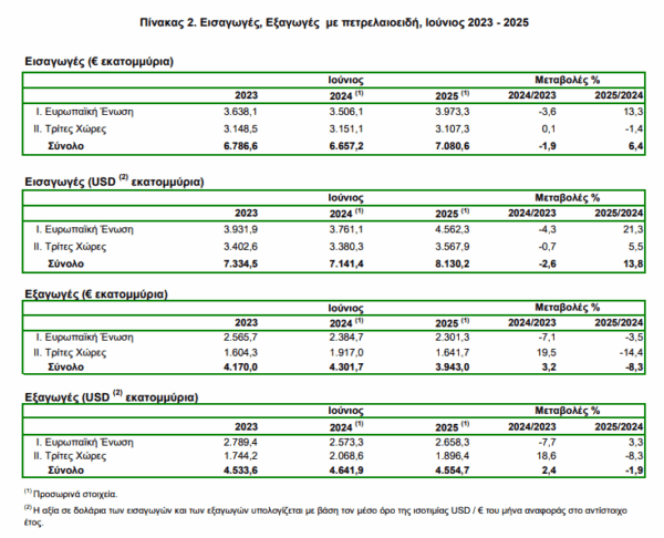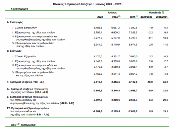 Το έλλειμμα του εμπορικού ισοζυγίου κατά τον μήνα Ιούνιο 2025 ανήλθε σε 3.137,6 εκατ. ευρώ (3.575,5 εκατ. δολάρια) έναντι 2.355,5 εκατ. ευρώ (2.499,5 εκατ. δολάρια) κατά τον ίδιο μήνα του έτους 2024, παρουσιάζοντας αύξηση, σε ευρώ, 33,2%. Η αντίστοιχη αξία χωρίς τα πετρελαιοειδή κατά τον μήνα Ιούνιο 2025 παρουσίασε αύξηση του ελλείμματος κατά 452,1 εκατ. ευρώ,