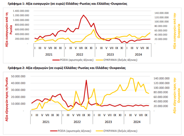 Σε σχέση με την Ουκρανία οι εξαγωγές κατέγραψαν ισχυρή μείωση 16,8% εν αντιθέσει με τις εισαγωγές που εκτινάχθηκαν κατά 73,1%. Το εμπορικό ισοζύγιο Ελλάδας-Ουκρανίας τον Οκτώβριο 2024 ήταν θετικό και ανήλθε σε 26,3 εκατ. ευρώ (πλεόνασμα)