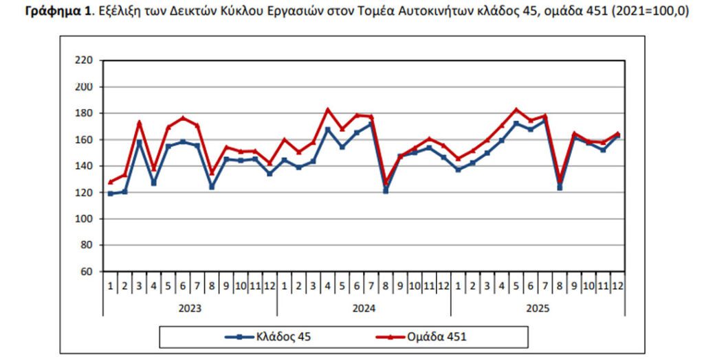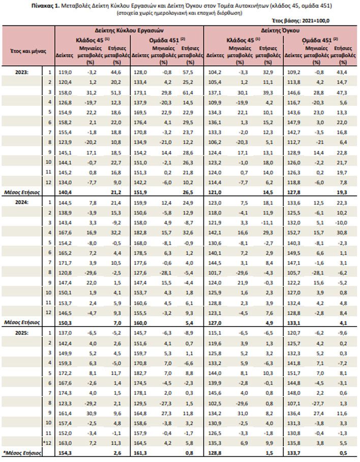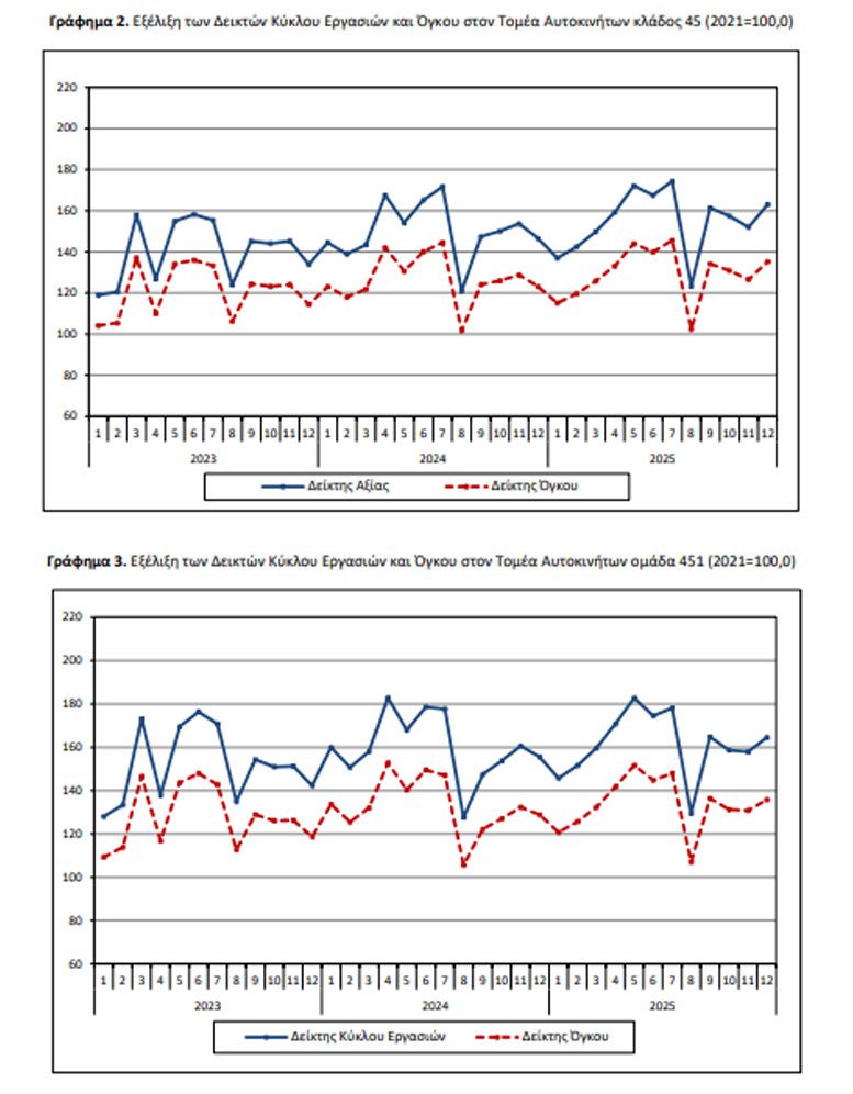 Η Ελληνική Στατιστική Αρχή ανακοίνωσε τους μηνιαίους Δείκτες Κύκλου Εργασιών και Όγκου στον Τομέα των Αυτοκινήτων με έτος βάσης 2021=100,0 της περιόδου Οκτωβρίου-Δεκεμβρίου 2025, η εξέλιξη των οποίων, σύμφωνα με προσωρινά στοιχεία χωρίς ημερολογιακή και εποχική διόρθωση, έχει ως εξής: