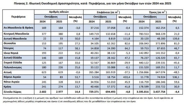 Οι εκδοθείσες άδειες Ιδιωτικής Οικοδομικής Δραστηριότητας, στο σύνολο της Χώρας, κατά τον μήνα Οκτώβριο 2025 ανήλθαν σε 2.977 οικοδομικές άδειες, που αντιστοιχούν σε 694.493 m2 επιφάνειας και 3.437.754 m3όγκου, παρουσιάζοντας αύξηση κατά 14,4% στον αριθμό των οικοδομικών αδειών, μείωση κατά 4,8% στην επιφάνεια και μείωση κατά 4,4% στον όγκο, σε σχέση με τον αντίστοιχο μήνα του 2024 (Πίνακας 2).