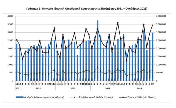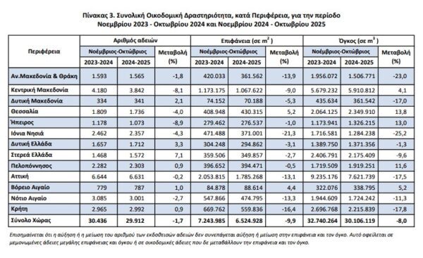 Κατά την περίοδο των τελευταίων δώδεκα μηνών, δηλαδή από τον Νοέμβριο 2024 έως τον Οκτώβριο 2025, το μέγεθος της Συνολικής Οικοδομικής Δραστηριότητας (Ιδιωτικής-Δημόσιας) με βάση τις εκδοθείσες οικοδομικές άδειες, στο σύνολο της Χώρας, ανήλθε σε 29.912 οικοδομικές άδειες, που αντιστοιχούν σε 6.524.928 m2 επιφάνειας και 30.106.119 m3όγκου.Σε σχέση με την αντίστοιχη περίοδο Νοεμβρίου 2023 – Οκτωβρίου 2024 παρατηρήθηκε μείωση κατά 1,7% στον αριθμό των οικοδομικών αδειών, μείωση κατά 9,9% στην επιφάνεια και μείωση κατά 8,0% στον όγκο (Πίνακας 3).