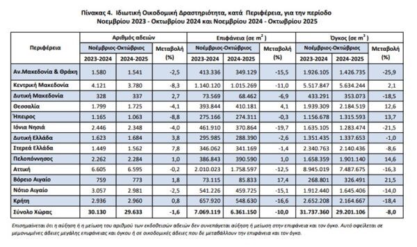 Κατά την ίδια χρονική περίοδο, Νοεμβρίου 2024 – Οκτωβρίου 2025, η Ιδιωτική Οικοδομική Δραστηριότητα, εμφανίζει στο σύνολο της Χώρας, μείωση κατά 1,6% στον αριθμό των εκδοθεισών οικοδομικών αδειών, μείωση κατά 10,0% στην επιφάνεια και μείωση κατά 8,0% στον όγκο, σε σύγκριση με την αντίστοιχη περίοδο Νοεμβρίου 2023 – Οκτωβρίου 2024(Πίνακας 4). Το ποσοστό συμμετοχής της Δημόσιας Οικοδομικής Δραστηριότητας στον συνολικό οικοδομικό όγκο, για την ανωτέρω περίοδο, είναι 3,0%.