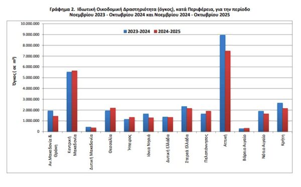 Στο 12μηνο Νοεμβρίου 2024 – Οκτωβρίου 2025 καταγράφεται μείωση συνολικά στην έκδοση οικοδομικών αδειών 12,7% και των αδειών από ιδιώτες κατά 10%.